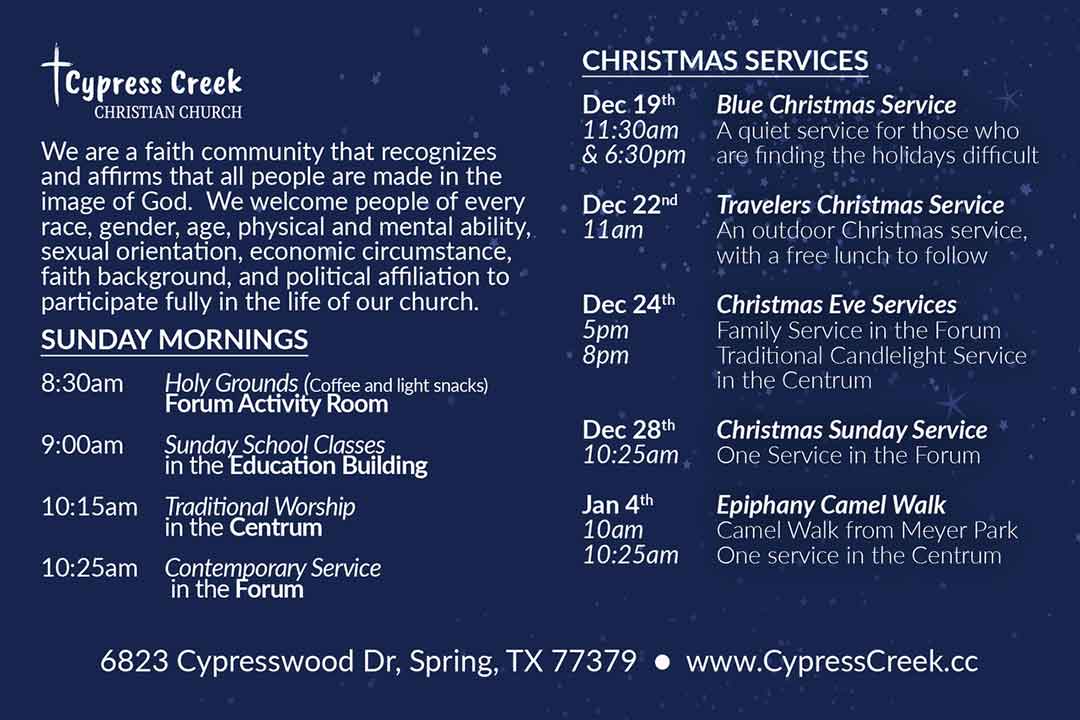 Because God first loved us, (1 John 4:19) Cypress Creek Christian Church is a faith community that recognizes and affirms that all people are made in the image of God. We welcome people of every race, gender, age, physical and mental ability, sexual orientation, economic circumstance, faith background, and political affiliation to participate fully in the life of our church. This includes, but is not limited to, baptism, communion, marriage, ordination, and parent/child dedications. We value a diversity of beliefs and are committed to Living the Love First Life with all of God’s people.