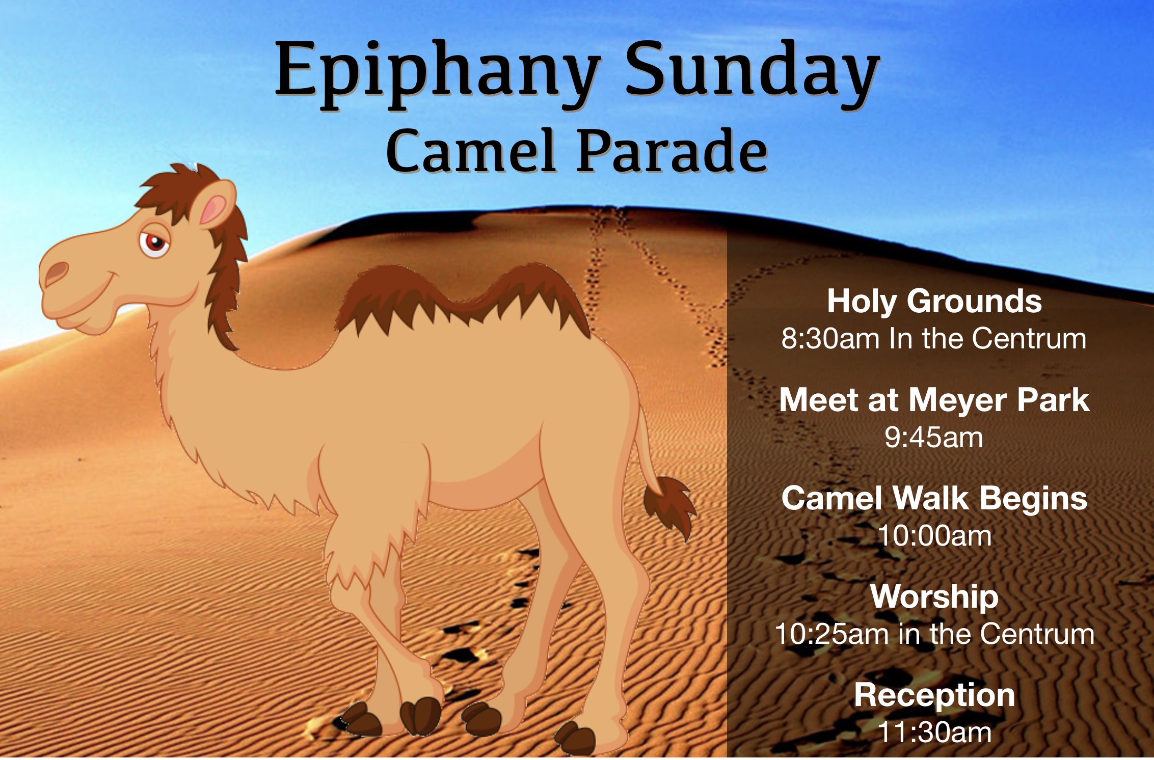 IT IS EPIPHANY SUNDAY!! And of course, that means it is the Camel Parade (assuming it is not raining). By having a camel today, we are assuming (imposing upon) the Magi an animal that may or may not have been present. It is interesting how often images from the life of Jesus bring a camel into the scene. I just looked at some Children’s Sunday School material from the early 90’s, and a number of pictures showed a camel in the background. I don’t know why, but I was surprised to learn that the word camel only appears in the New Testament four times, and in every single case, Jesus was teaching and using the camel to make a point – “…it’s easier for a camel to squeeze through the eye of a needle than for a rich person to enter the Kingdom of God,” and then later, when he accused some of the religious leaders of being hypocrites, he said: “You blind guides! You filter out an ant but swallow a camel.” At no point in the New Testament is there a casual reference to a camel who happens to be close by. As one who has a pretty good imagination and often likes to put myself in the stories of scripture, I have pictured people riding camels or standing next to one drinking from a stream. Our imagination should always be tempered by what scripture actually says, but throwing in a camel here and a camel there will probably not change the overall meaning of the stories. My Magi have camels, but if some day we learn it was two donkeys, it ain’t going to break my faith. But today, for conversation purposes, we are covering both possibilities as we will have a camel and a donkey.