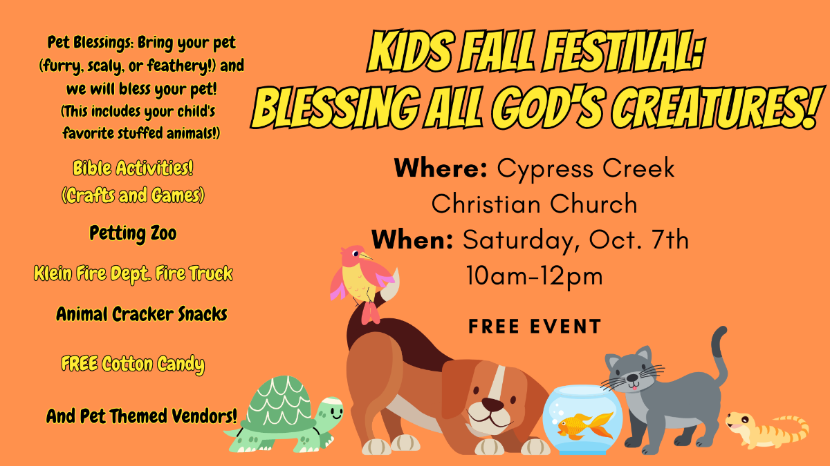 Tomorrow is a big day around Cypress Creek Christian Church. I believe it was nine years ago when I made a request for some folks who might help with a crazy idea that was brewing in my head. I wanted to do a Blessing of the Animals, and two of the very first people to step forward were Paul and Mary Hupman. They and others jumped in with both feet, and since then, others have come alongside in the planning and implementing of this event. I give thanks to Mariah, along with Matthew and Joanna Anderson, who have done a lot of work behind the scenes to make this year’s event wonderful. There is also a long list of other volunteers who will be there tomorrow, welcoming and engaging all of our community friends who will bring an animal (or stuffed animal) for blessing, or maybe just drive by and want to meet some of the animals at the petting zoo. We do this event in early October, around the time when the Feast Day of St. Francis of Assisi is celebrated. Of course, St. Francis lived a life of awe and respect for all creation, and as the stories of his life tell us, he loved the animals. Tomorrow, my hope is that we communicate a belief that all living things are precious in the sight of God and that for many people, their four-legged creature (maybe with no legs and slithers) is a true member of the family. We give thanks for the unconditional love often displayed by animals, along with the real gift of support and encouragement that many people feel. We do not have any living pets in the Frogge home because of serious allergies, but this remains one of the more exciting days for us. I hope to see all of you there, even if you simply come to say to a community person, “Welcome to Cypress Creek Christian Church. We’re glad you are here!”