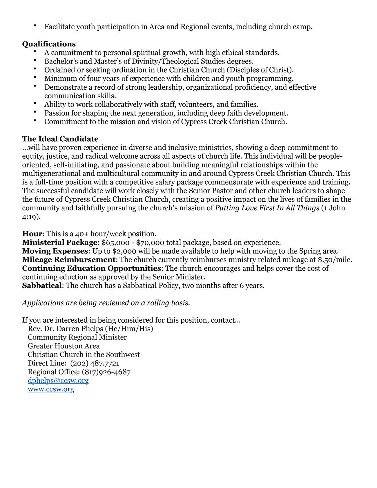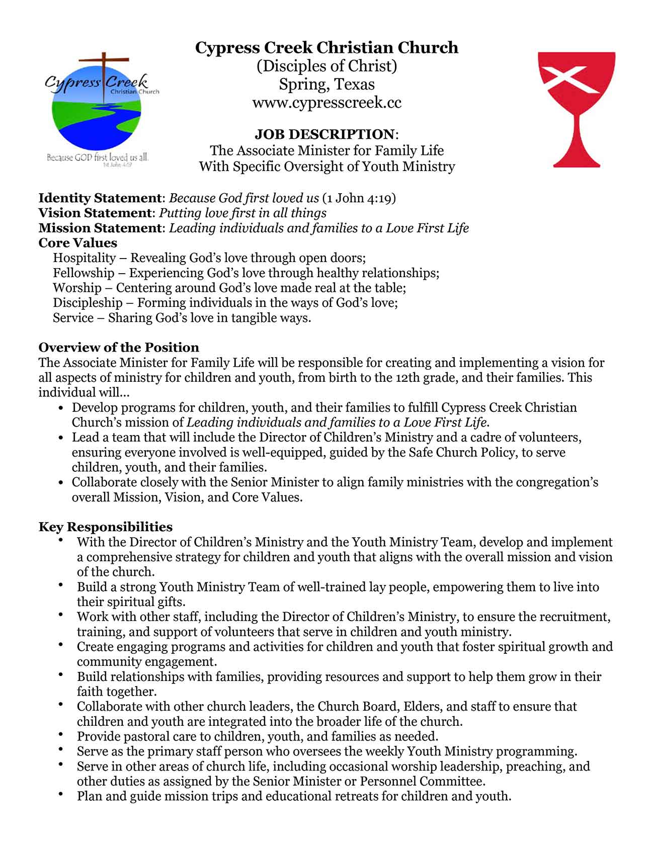 Join Our Church Team Join The Team at Cypress Creek Christian Church Download Our Job Posting and Join Our Church Team Today